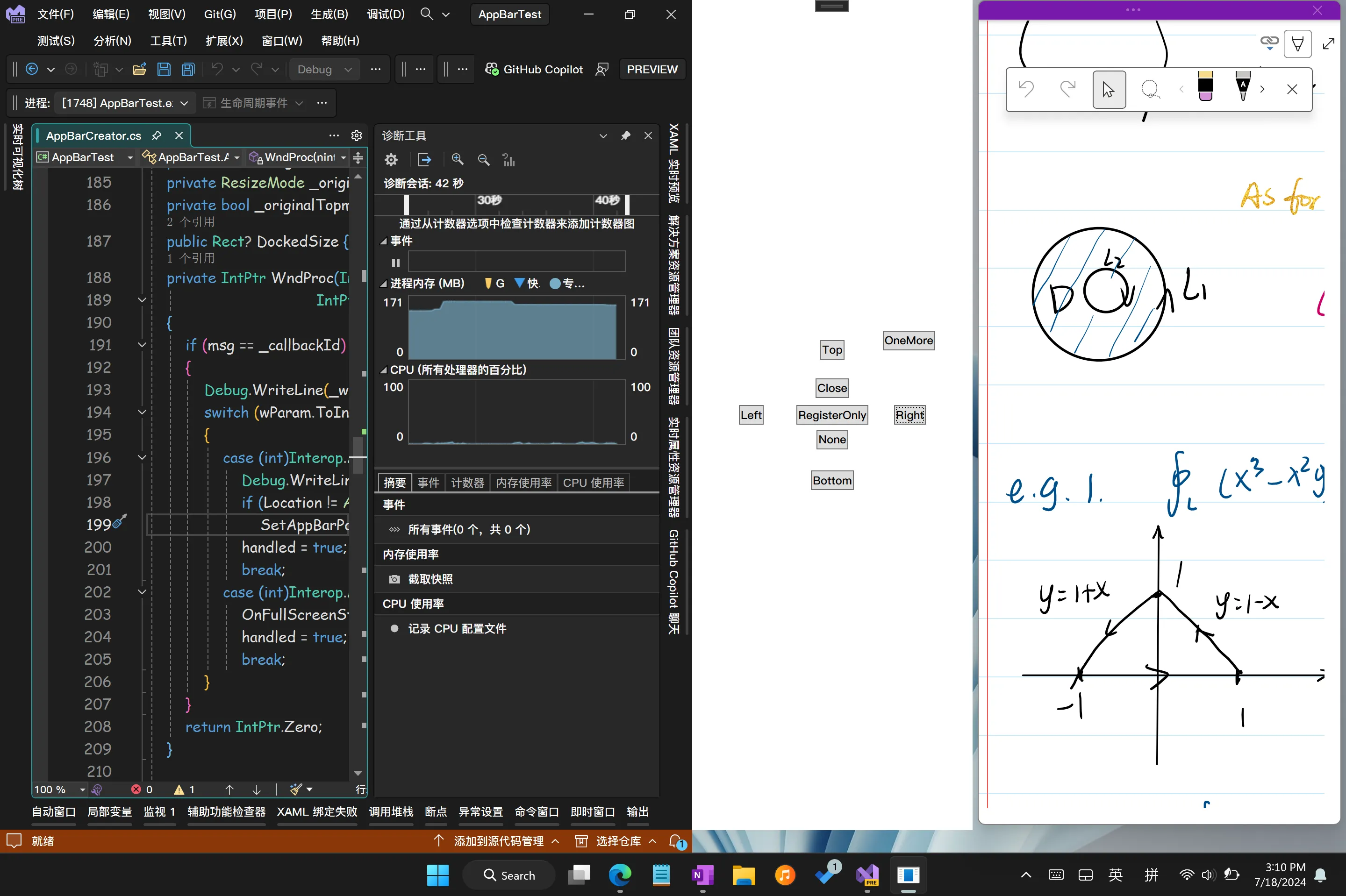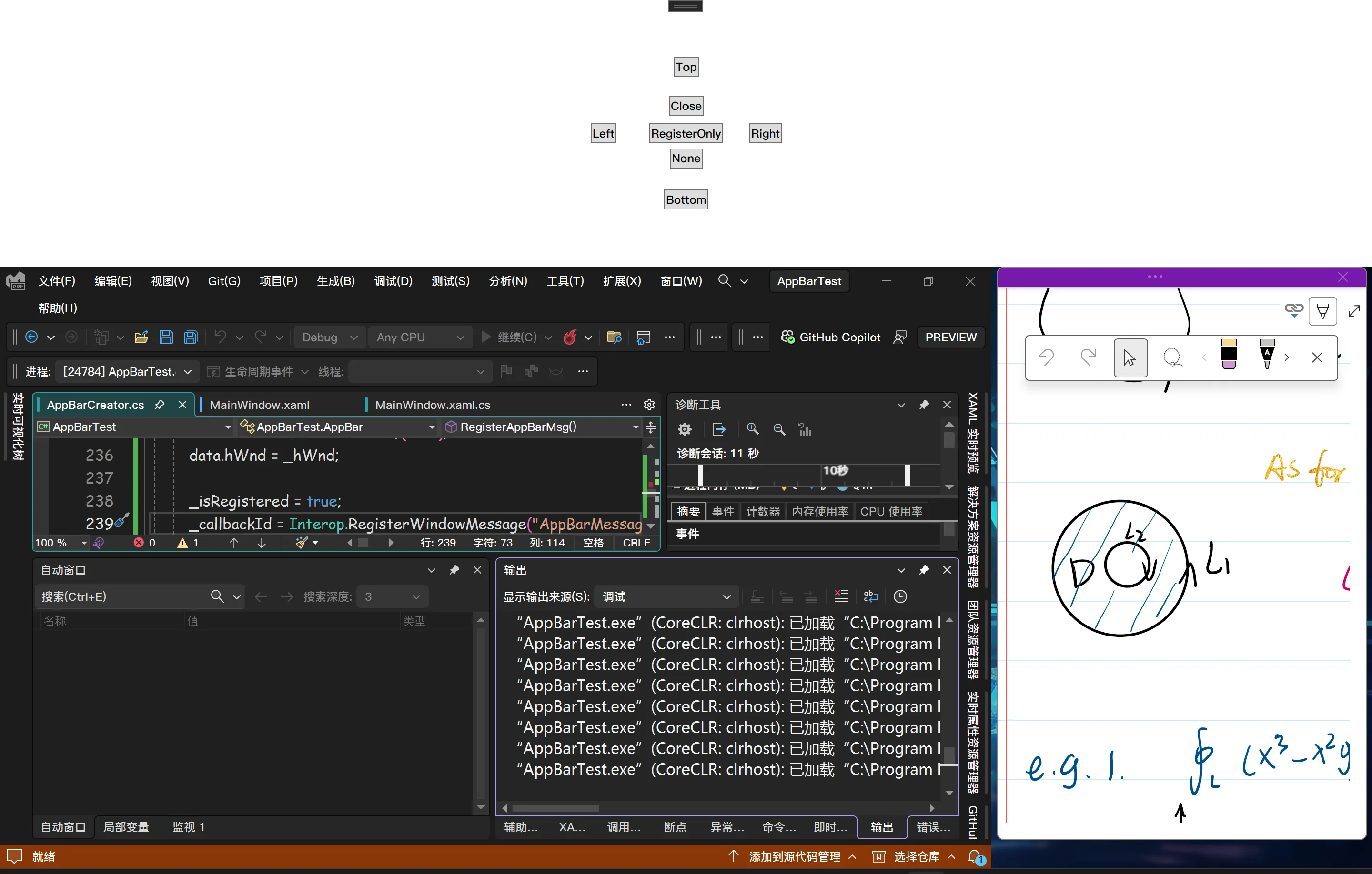 1. 在我的github上的实例程序中,如果你将两个同进程的窗口并排叠放的话,会导致explorer和你的进程双双爆栈,windows似乎不能很好地处理这两个并排放置的窗口,一直在左右调整位置,疯狂发送ABN_POSCHANGED消息。(快去clone试试,死机了不要打我) 但是并排放置示例窗口和OneNote的Dock窗口就没有问题。